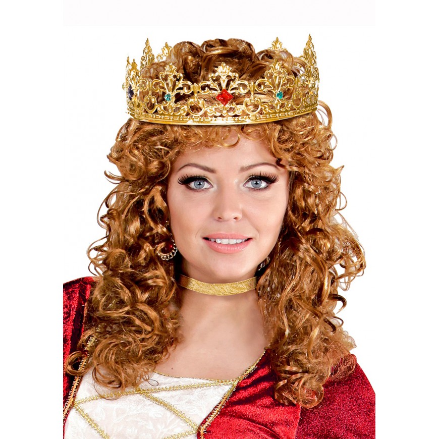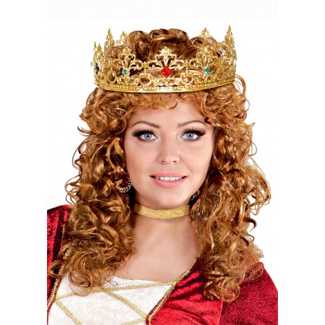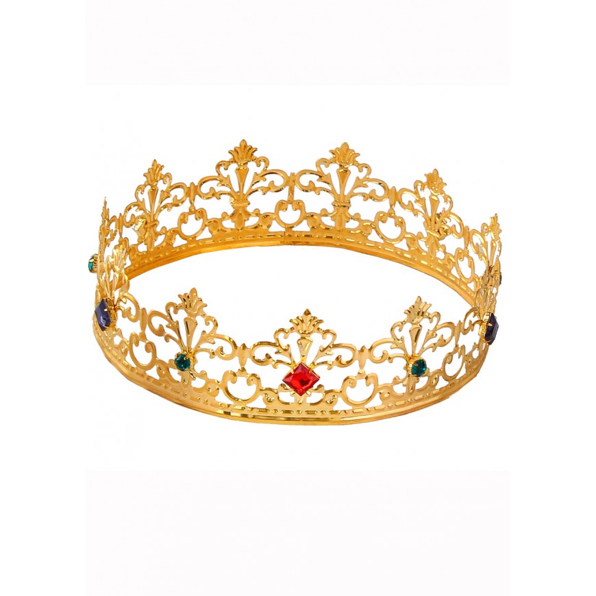 Cette copie de couronne de reine ou de roi en métal doré présente une structure ajourée avec des motifs réguliers et des fausses pierres colorées réparties tout autour. Le métal doré apporte un rendu net et de très belle qualité pour vos soirées événementielles.