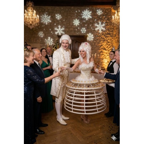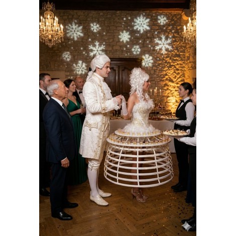Ayez le sens de la fête avec la robe service à champagne : pour vos soirées évènementielles, remplacez le traditionnel service au plateau de vos boissons par un hôte costumé en marquis et une hôtesse costumée en marquise recouverte d’une élégante structure blanche qui sert de comptoir en forme de robe !