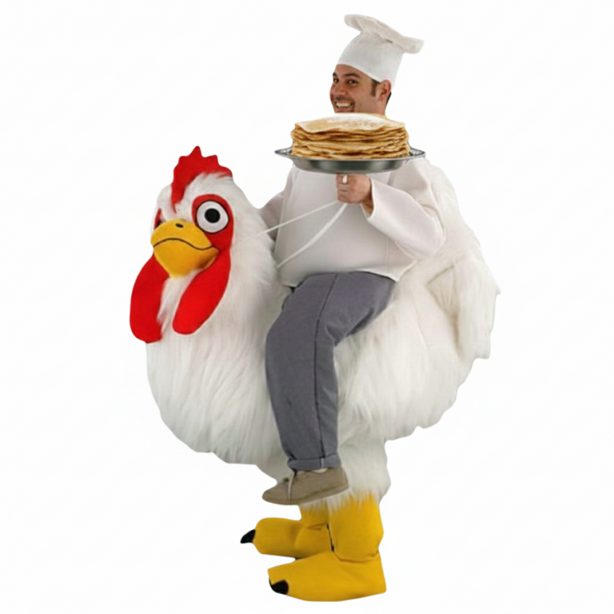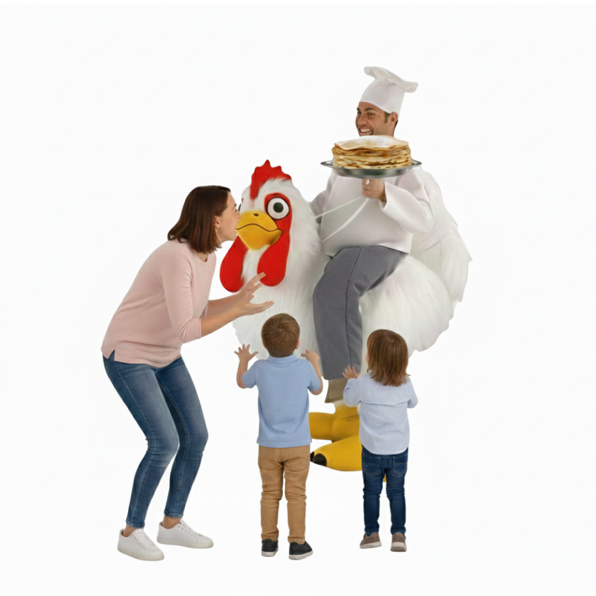 Ce chef pâtissier sur le dos de sa poule géante offre ses crêpes avec en "Option" son copain Titi le poussin jaune le célèbre poussin jaune qui pourra accentuer le service et se prêter aux jeux des photos pour animer votre fête de la chandeleur dans le joie et la bonne humeur.