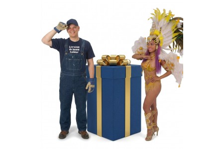 Offrez un cadeau original, un paquet cadeau géant sur un plateau à roulettes ou s'y trouve à l'intérieur un artiste caché pour un spectacle hyper FUN.
