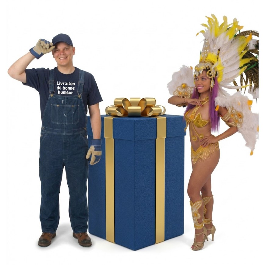 SYNOPSIS : Un comédien déguisé en livreur débarque sur le lieu de la fête et vient livrer de votre part à la personne de votre choix un gros-cadeau géant avec joli nœud. À l’intérieur s’y trouve une surprise de votre choix : un chanteur avec le répertoire favori du fêté, un chippendale, une strip tiseuse, un ou une danseuse à thème, un sosie de star, un transformiste, un petit Nain ...
