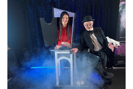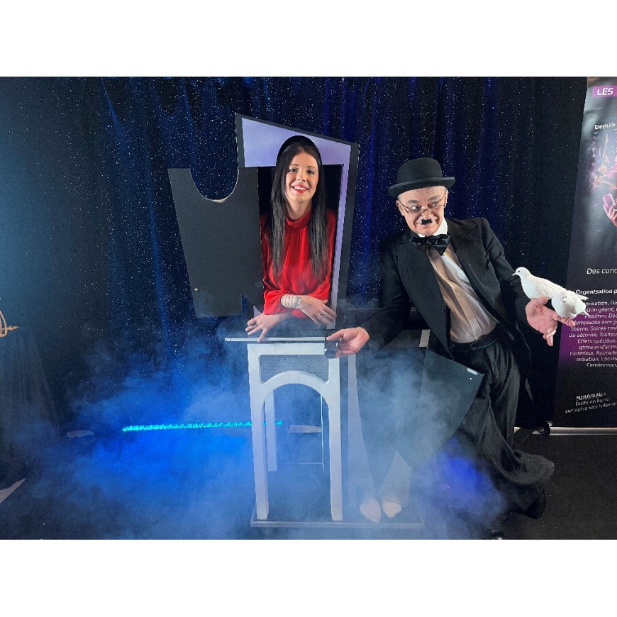 Et, pour une animation plus complète, Melle Morgane magicienne offre à Charlot 2 oiseaux rares bien éduqués, Roméo et Julietta, tous les passants veulent faire une photo avec nos 4 personnages Mlle Morgane propose même à Charlot de lui montrer une GRANDE ILLUSION, la célèbre femme coupée,