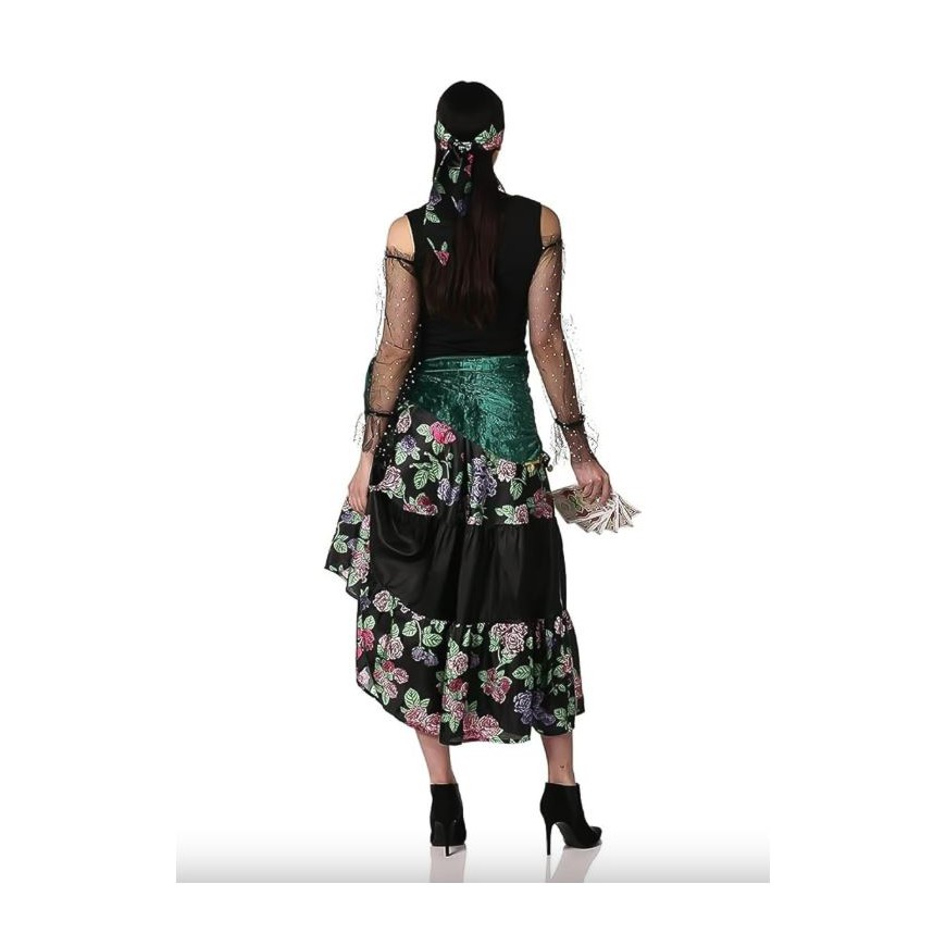 La chemise est noire avec des manches longues transparentes et un corset violet avec un laçage orange. La ceinture est verte pourvue de décorations en forme de pièces d'or. Celle-ci viendra ajuster votre taille et s'ajoutera à la jupe noire avec des motifs en formes de roses. Le bandeau noir viendra rappeler les motifs de roses de la jupe.
