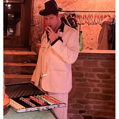 Le costume LUXE est idéal pour vos soirées à thèmes, un costume beige comme au temps d'Al Capone, un costume sur le thème de la prohibition, style gangster, idéal pour une soirée sur un thème Gatsby ou Mondain avec un costume blanc avec rayures, tel un voyou élégant....Un vrai gentleman en apparence, car en réalité le personnage est un truand habile pour rafler l'argent, avec un gros cigare et son chapeau Borsalino...