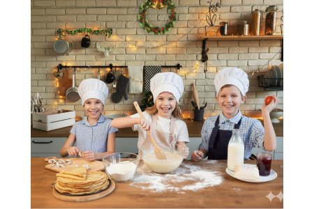 Cette image montre une scène joyeuse et chaleureuse de trois enfants cuisinant ensemble dans une cuisine au style rustique. L'ambiance générale évoque les fêtes de fin d'année et le plaisir du partage en famille.