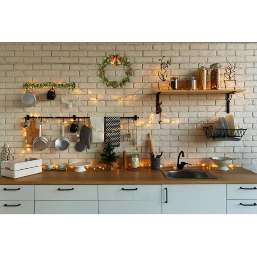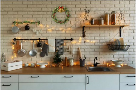 Décorations festives : Une couronne de Noël avec des cloches dorées en haut du mur, une guirlande de sapin et des guirlandes lumineuses (type guinguette) qui serpentent sur le mur et les étagères.