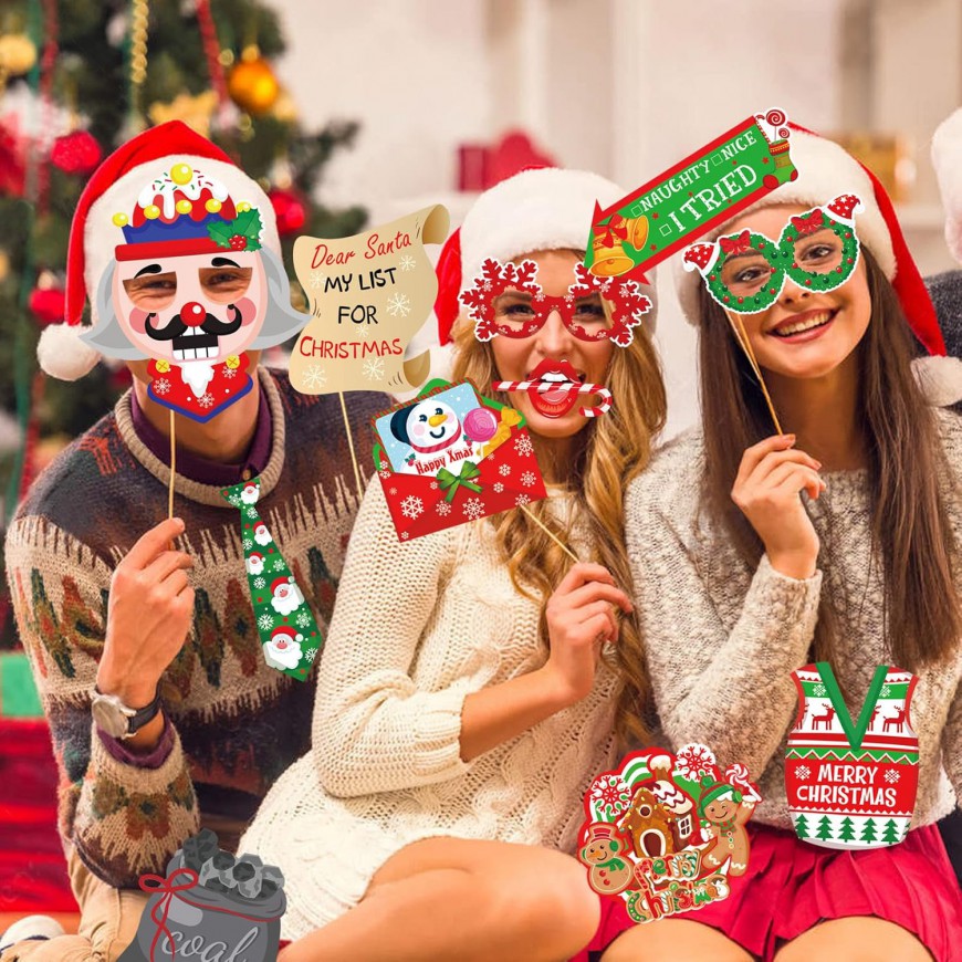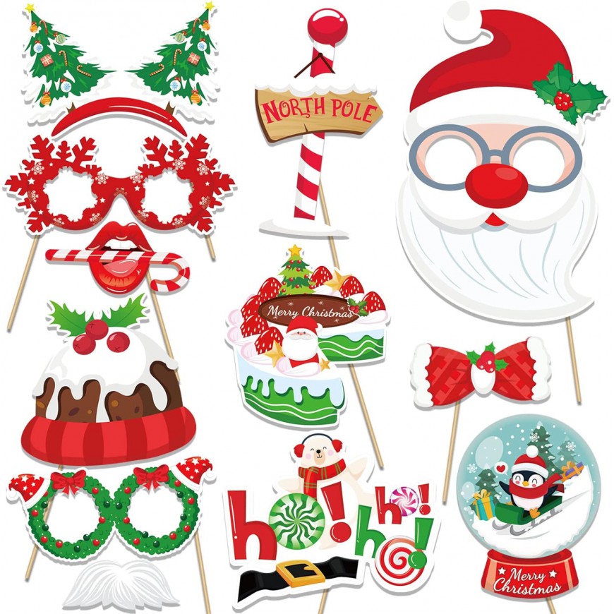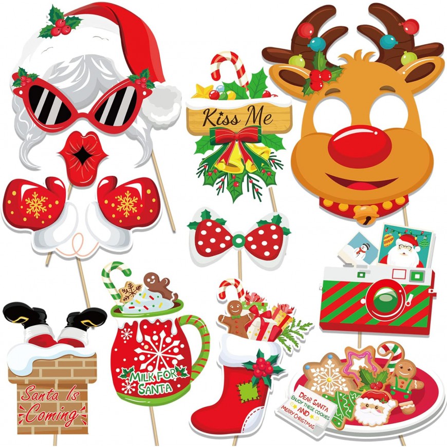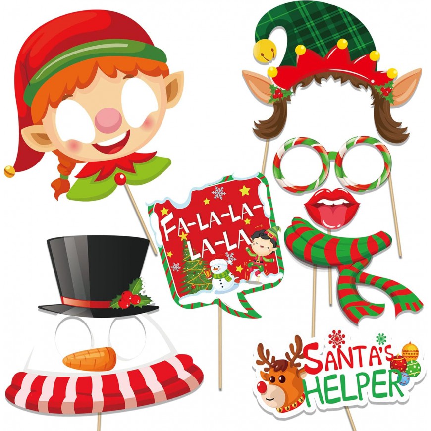 Accessoires Photobooth Noël – voici la location d'un kit avec 40 pièces Photobooth Noel idéal pour s’amuser devant une box photos, ces accessoires de Noël amusant lors de fête de Noël, fête d'hiver, fête du personnel lors de vos événements d’entreprise, arbre de Noël, etc. Des objets amusants sur le thème de Noël - Accessoires pour photomaton, borne photo comme :