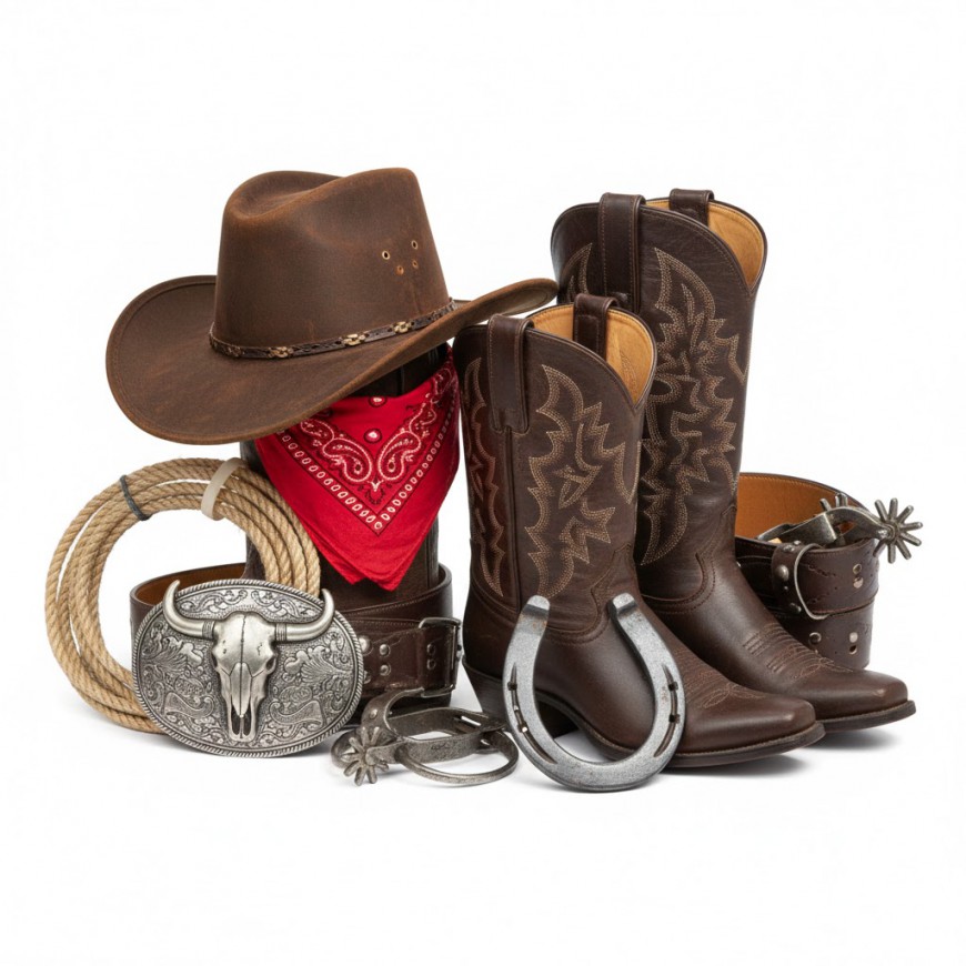 Détails iconiques : Chapeaux Stetsons, bottes en cuir, guitare folk, et cactus pour la touche désertique.