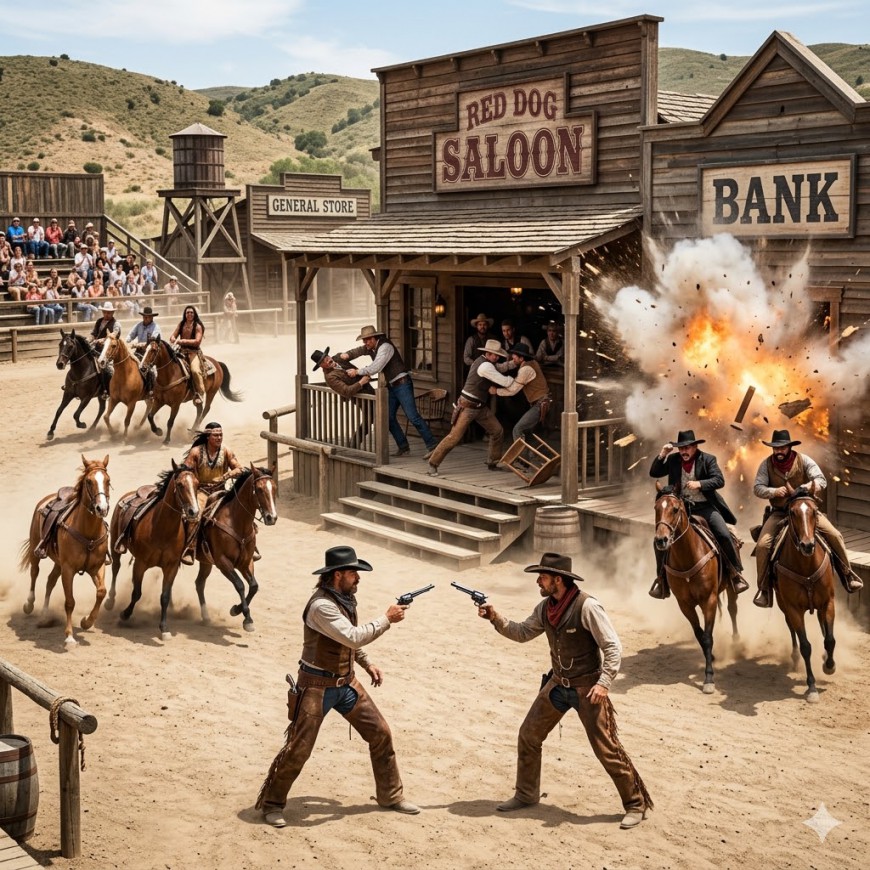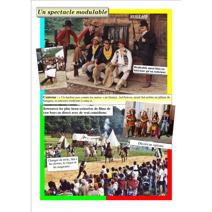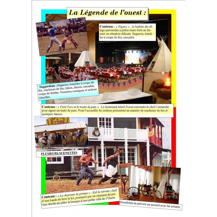 Nous reconstruisons une vraie ambiance Western, laissez vous guider dans cette ambiance folle des plus grands films de Western Américain avec un spectacle composé de deux à trois séquences de reconstitution sur le légende de l'Ouest, chaque séquence dure en moyenne de 15 à 20 minutes chacune, séparées et indépendantes les unes des autres, mêlant humour et action.